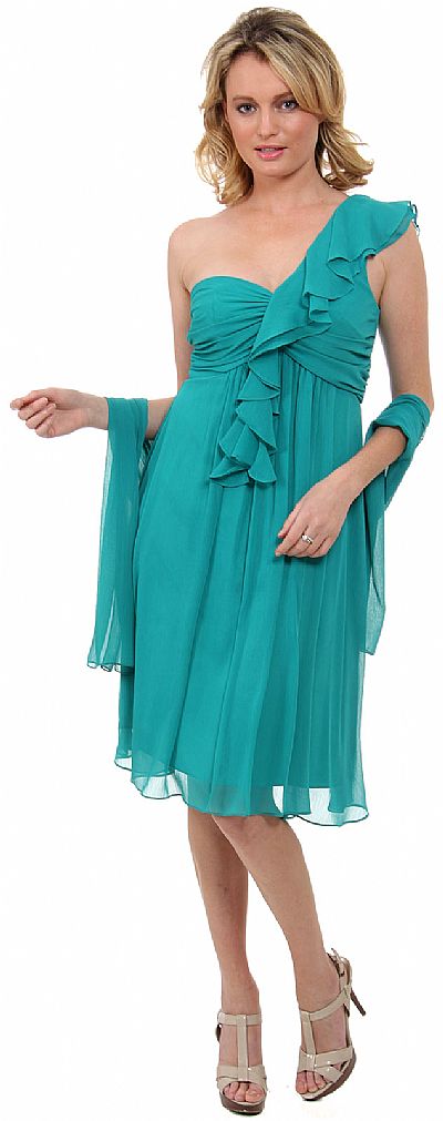 Knee length cocktail dress has a one shoulder strap with tier and ruffle detail and pleated detail across the bust. Matching scarf included. Back zipper closure. Made in USA.