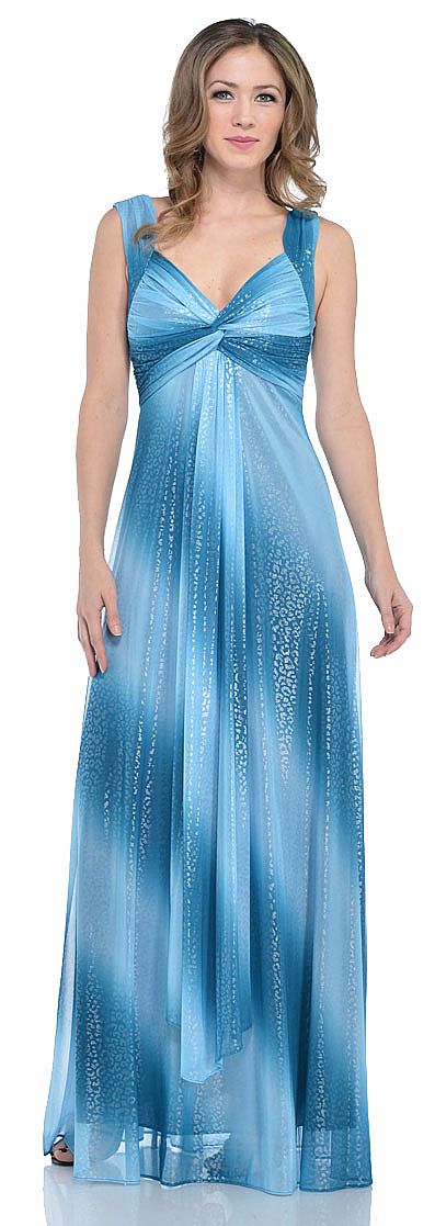 Animal print ombre formal dress with metallic foiling all over it. The dress has gathered broad straps with a twist in the middle of the shirred bust. Deep neck dress has a sash hanging in the front. Back zipper closure. Made in USA.