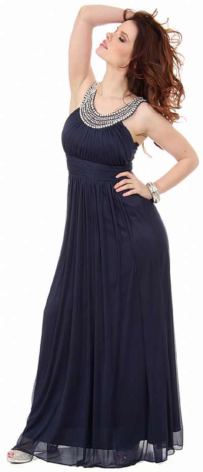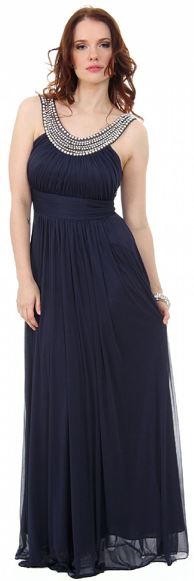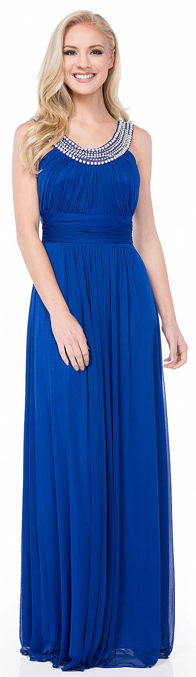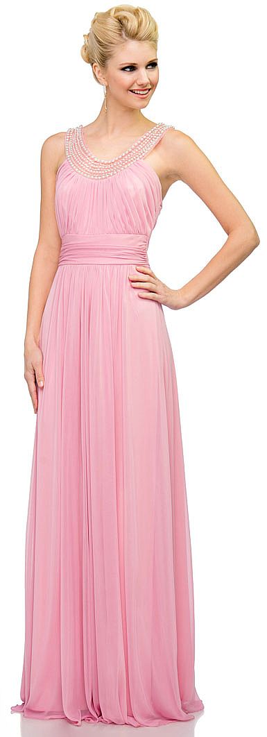 U-Neck Empire Cut Long Formal Dress with Pearls Accent. Pearls & rhinestones along the neckline give a necklace like look. Shirred vertically at the bust & waistband is also shirred. Skirt is gathered below the center of the waist. Broad straps at the back with zipper closure also. Matching scarf included. Made in USA.