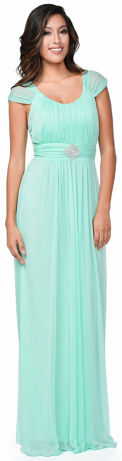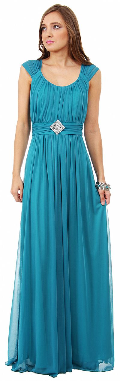 Scoop Neck Thick Straps Shirred Long Formal Bridesmaid Dress. Shirred bust & waist with gathered broad straps in the front & back also. Diamond shape rhinestones broach at the waist with little gathered skirt below waist. Straps make a v-shape at back with zipper closure. Made in USA.