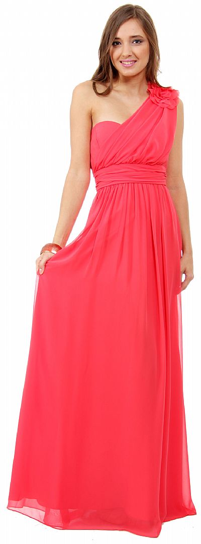 One Shoulder Long Formal Prom Dress with Floral Applique. Single shoulder is gathered along the bust and adorned with layered floral applique. Ruched waistband on this empire cut formal dress which can be worn as bridesmaid dress, prom dress or on any formal event. Back zipper closure. 100% polyester. Made in USA.
