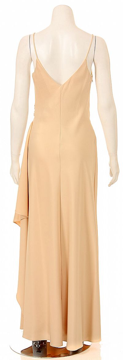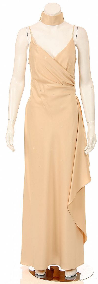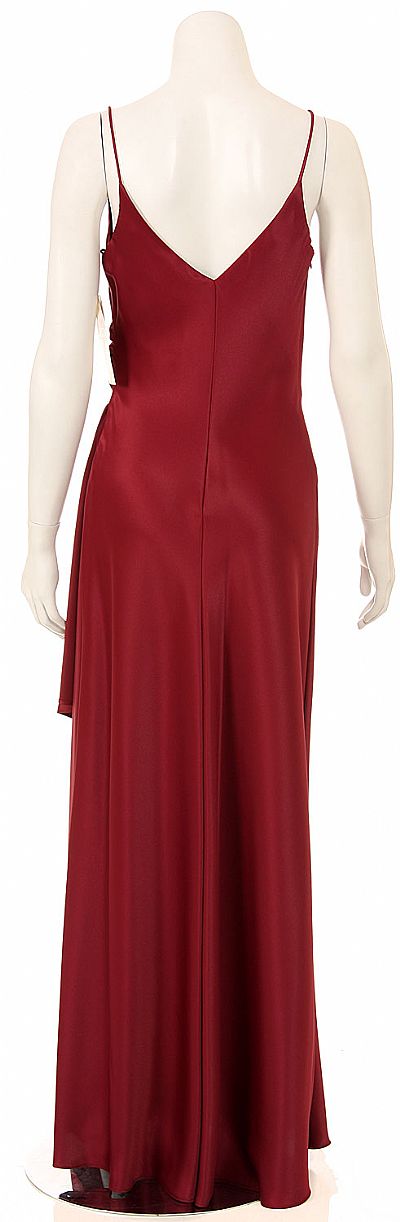 Full length satin dress with spaghetti straps, bust overlay.