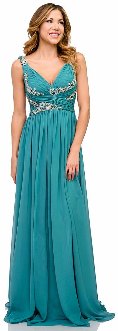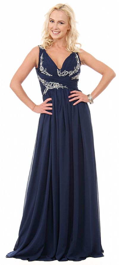 Deep V-Neck Ruched Floor Length Formal Prom Dress. Pleated bust has crossed straps design at waist with sequined floral patches all over it. Straps also have floral patches with V-shape back. Back zipper closure & comes with matching scarf.