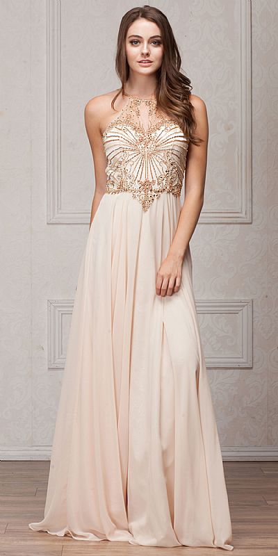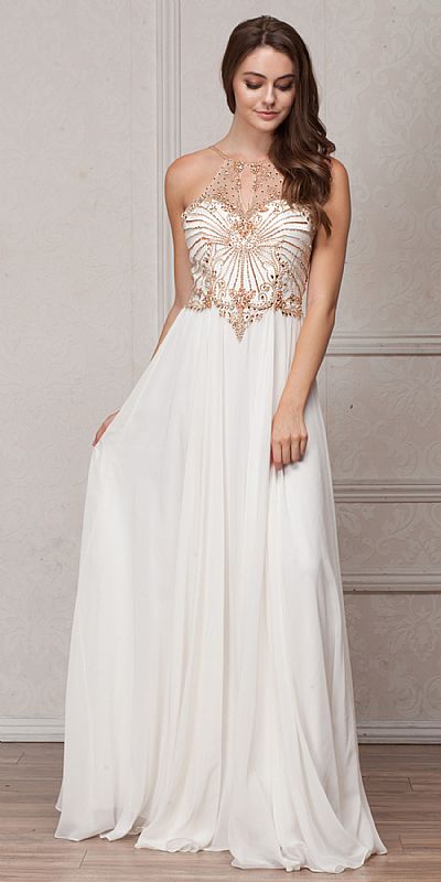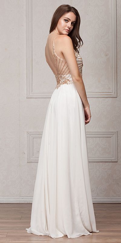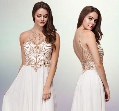 High Neck Beaded Mesh Bodice Long Chiffon Formal Dress. Sequins & beads make an elegant design at the sheer mesh bodice with sweetheart neck. Keyhole neck with beaded spaghetti straps along the back too. Floor length polyester chiffon skirt is layered with deep v-neck back with zipper closure. Imported.