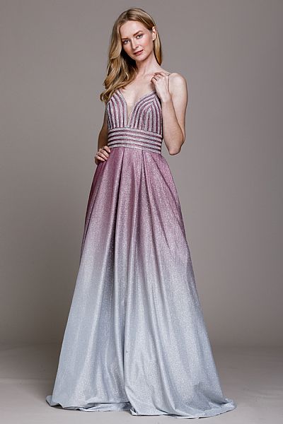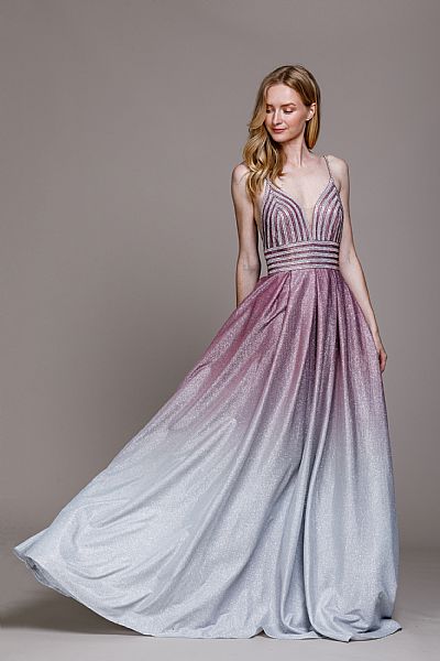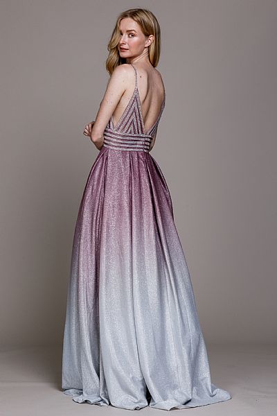 Empire cut prom gown with spaghetti straps. Open V shape back with zipper closure.