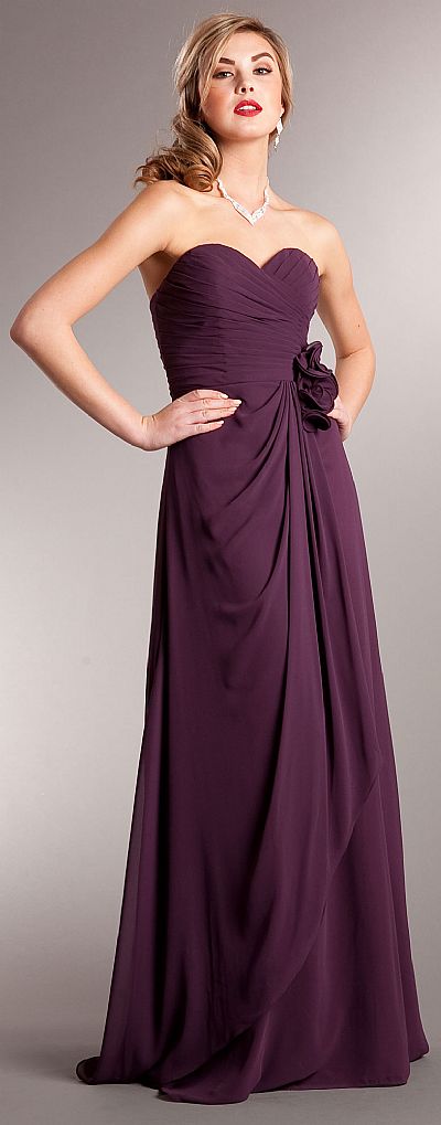 Pleated Wrap Style Floral Long Formal Bridesmaid Dress. Overlap style pleated bust all around with back zipper closure. Wrap style asymmetric overlay gathered at one side of waist accentuated with floral applique. Imported.