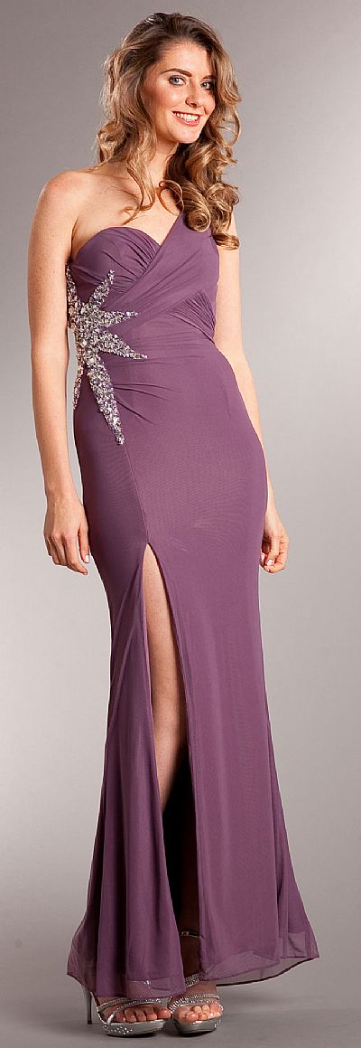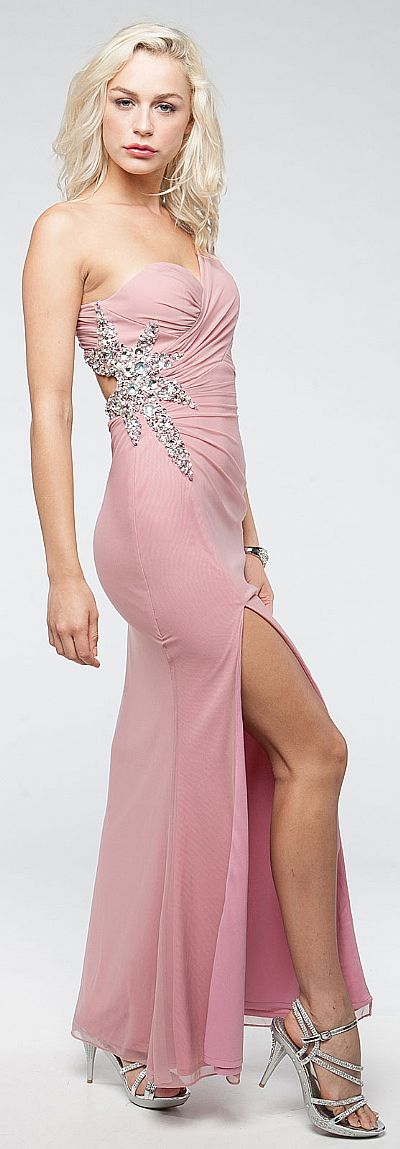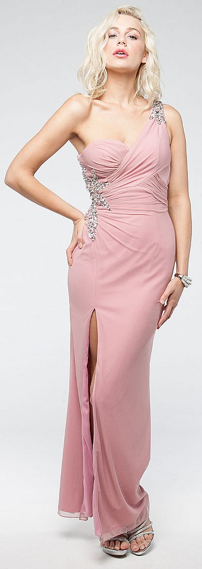 One Shoulder Elegant Long Formal Prom Dress with Bejeweled Side Waist. Ruched bodice is overlapped with bejeweled shoulder & one side of the waist. Long side slit in the front. Diagonal ruched strap at the back. Side zipper closure. Imported.