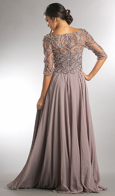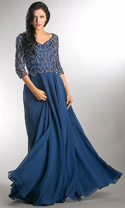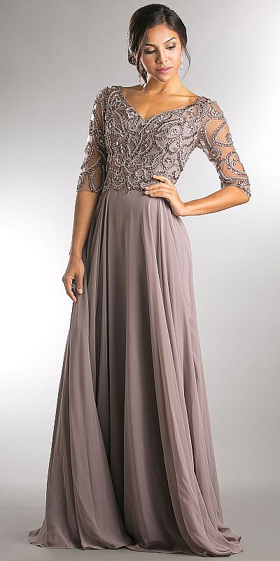 V-Neck Beaded Top Half Sleeves Long Mother of the Bride Dress. Endearing beads & rhinestones pattern at the top with three fourth sheer sleeves. Closed beaded back with zipper closure. A-shape flared polyester chiffon floor length skirt. Imported.