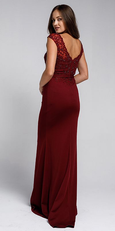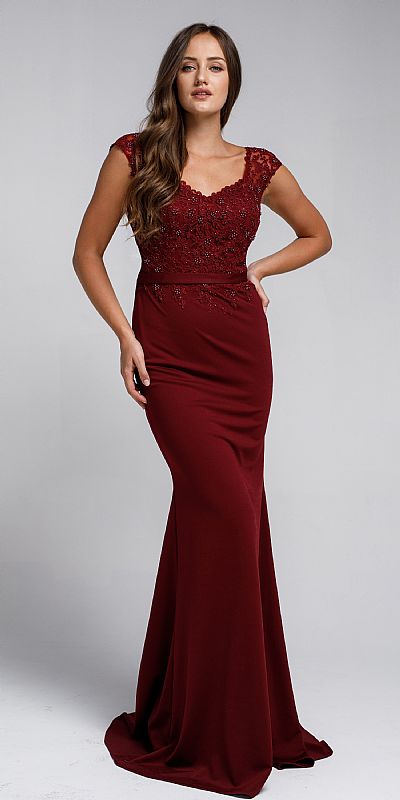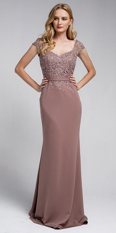 Embroidered formal evening gown with cap sleeves and belted waist. Features sweetheart neckline and back zipper closure.