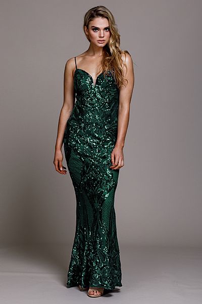 Sequin prom gown with spaghetti straps. This fitted gown accentuates the silhouette. Back zipper closure.