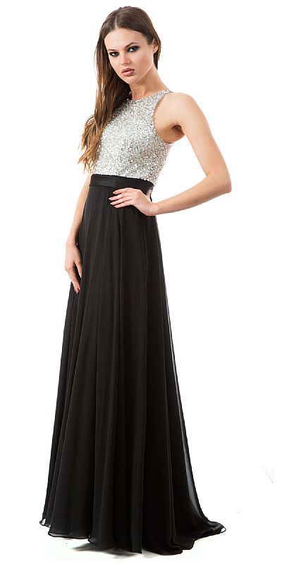 Sparkling Sequins Bodice Chiffon Skirt Long Formal Prom Dress. Sleeveless scoop neck dress has fully sequins bodice with rhinestones too. Satin band at waist with flared chiffon skirt & bra cups too. 62" long dress has sheer mesh back with sequins pattern too. Imported.