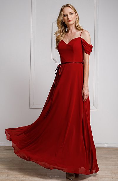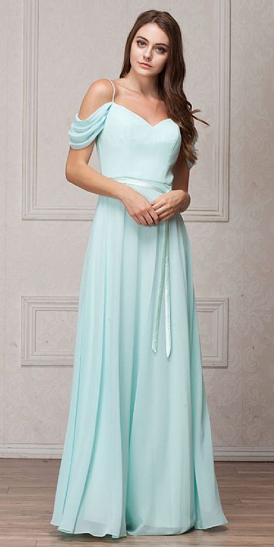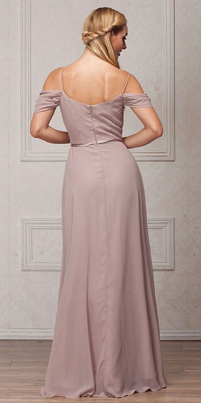 Spaghetti Straps Cold-shoulder Ribbon Waist Long Bridesmaid Dress. V-neck with gathered hanging sleeve (which can cover the shoulder too) & ribbon accent at the waist tied on the side. Round back with zipper closure. Imported.