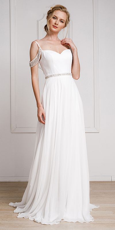 Formal dress with spaghetti straps and drop sleeves. Rhinestone over drop sleeves and waistline accentuates this dazzling gown. Features back zipper closure.