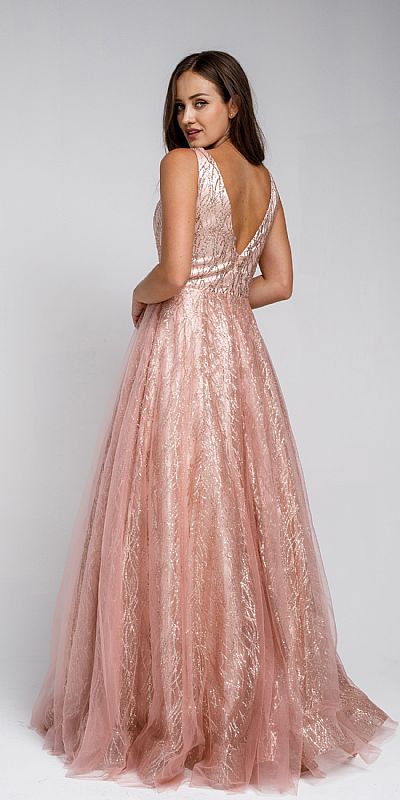 V Neck vines pattern tulle prom gown. Features exquisite and elegant pattern. Features back zipper closure.