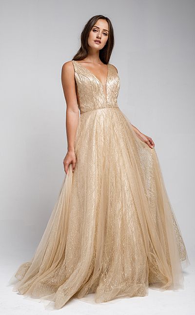 V NECK VINES PATTERN TULLE PROM GOWN (item #ar010)