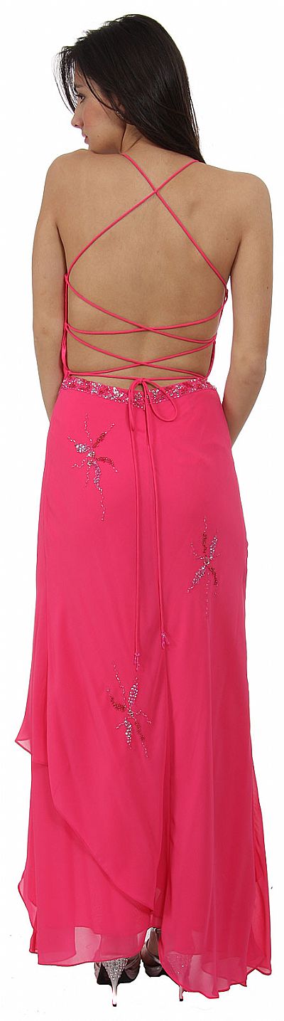This prom dress is polished with silver sequins over silk chiffon material. Layers of fabric give the skirt a highly stylish look. The criss-crossed open back adds more glamour.
