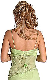 Spaghetti strapped full length dress. Semi see-thru bodice accentuated with beads. Ruffles cascading from lower hip to bottom of skirt gives an elegant finish to this prom dress.