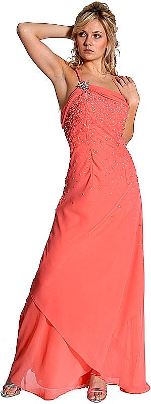 Elegant long formal prom dress with bead accent. Single shoulder braided strap accentuated with silver brooch.