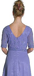 Half-sleeved formal gown has a beaded top with floral details, a round neckline, and a V-back with back zipper closure. A shape style dress. Made of 100% polyester. Imported.