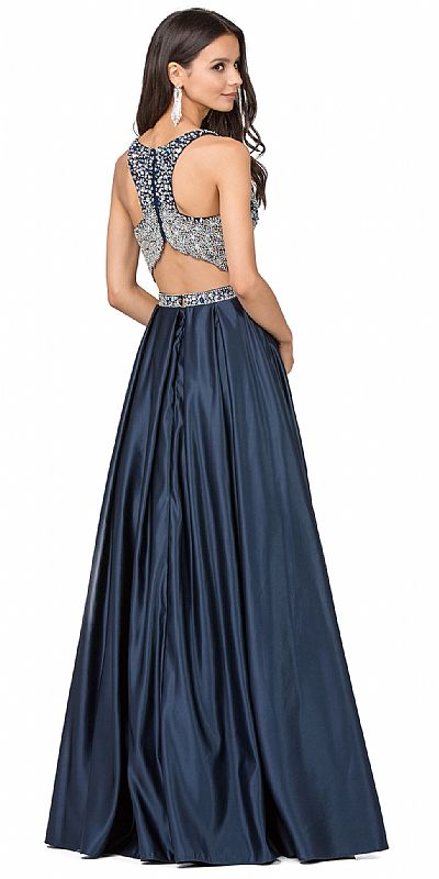 V-neck Bejeweled Top Long Satin Skirt Two Piece Prom Dress. Floral beads pattern on the a-shape hem on top with rhinestones on the bust part. Polyester satin skirt is approx 51" long with rhinestones belt on the waist. Racer back top with zipper closure & on the skirt too. Bra cups included & Imported.