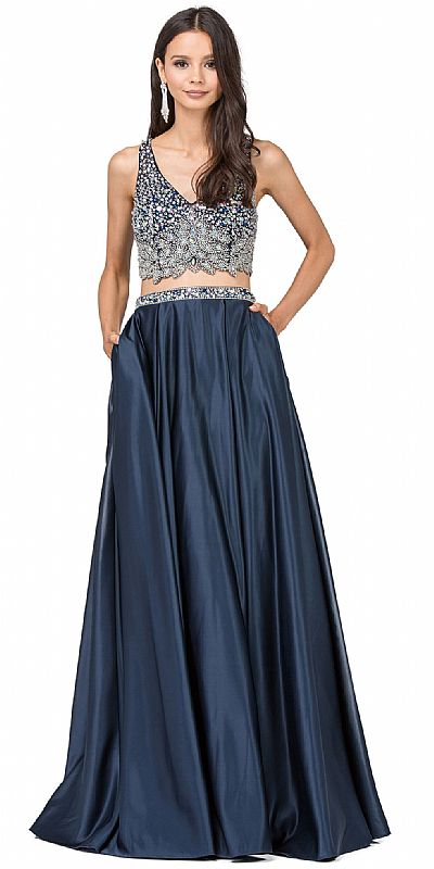 | V-NECK BEJEWELED TOP LONG SATIN SKIRT TWO PIECE PROM DRESS (item #p2243)