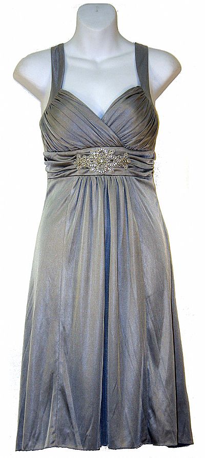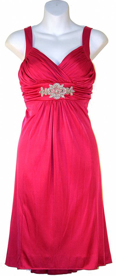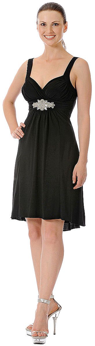 Empire Cut Ruched Bust Short Formal Party Dress. Overlap style little ruched bust with broad straps. Ruched waistband with embroidery on waist & asymmetrical skirt. Length is 40" approx. Back zipper closure. Imported.
