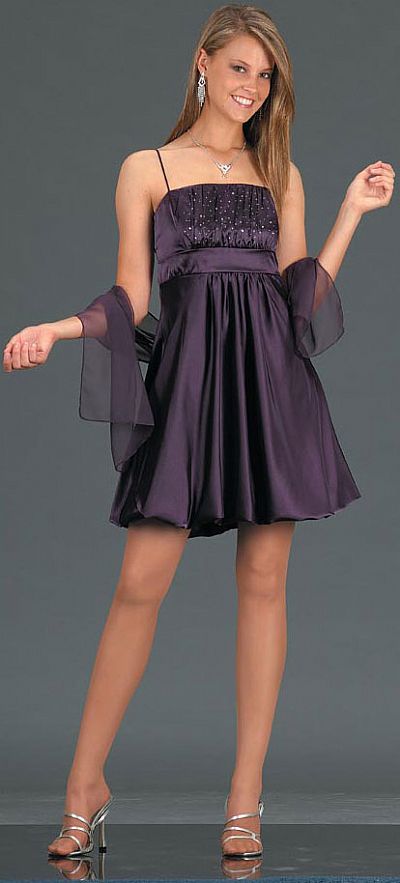 Spaghetti Straps Ruched Bust Short Party Dress. Little shiny stones glued on the bust with solid waistband. Gathered & bubble style skirt with folded hem. Length is 32" approx (from shoulders to hem). Back zipper closure. Imported.
