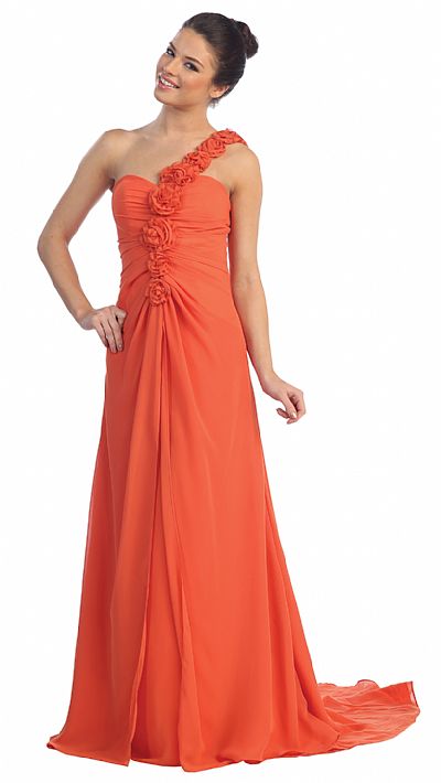 Off shoulder prom dress with a flower applique strap attached to the bodice of the dress and extended towards the shoulder and ending at the back of the dress. Dress has a little ruched bodice and flared bottom with a train at the back of the dress. Straps tie in the back style.100% Polyester Chiffon. Imported.