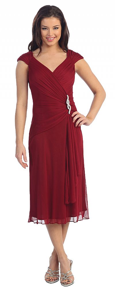 V-Neck Medium Length Cocktail dress with Hanging Sash. Broad straps look like cap sleeves on this dress with overlap ruched bodice. Long brooch on the side with hanging sash below it. V-back dress has a back zipper closure. Imported.