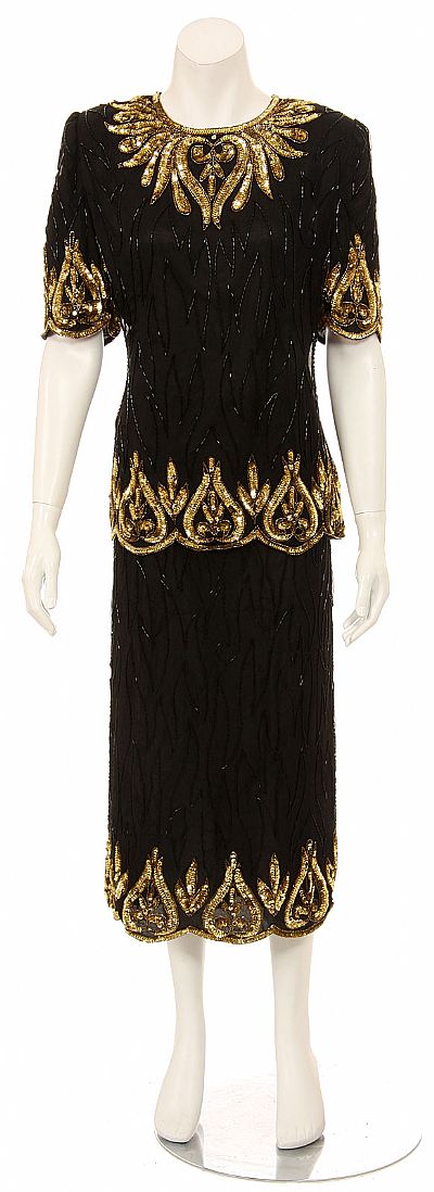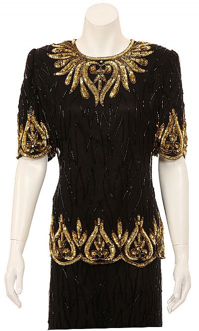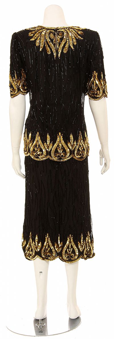 Hand Beaded Two Piece Black Formal Gown with Gold Sequin Details. Round neckline. Short sleeves with shoulder pads. Small slit in the back.
