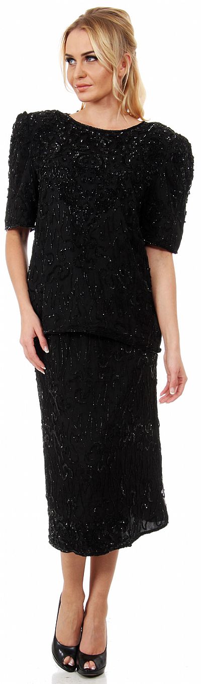 Half Sleeves Two Piece Beaded Blouse & Skirt Set. Round neck blouse is fully beaded with sequins pattern at the bodice. Shoulder padded blouse is 25" long with hook closure at the back. Straight skirt has elastic waistband & 31" long. Imported.