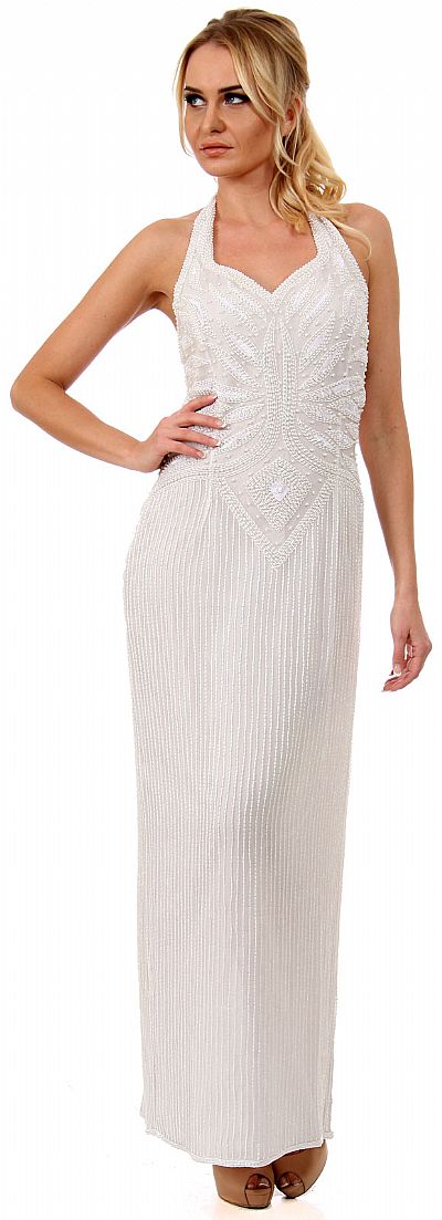 Halter V-Neck Beads & Sequins Leafy Bodice Long Formal Dress. Leaves pattern all around the bodice with broad straps closing at the back of the neck. Back zipper closure with long slit at the bottom. Padded bust on this silk chiffon dress with polyester lining. Imported.