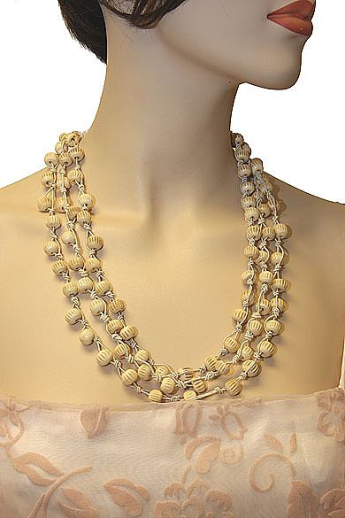 Ball and loop closure. Hand tied necklace made from rope threading and plastic beads. Contains three strands with beads that are hand tied in their individual slots. Total length measures 25 inches; drop length measures 13 inches.