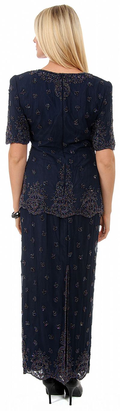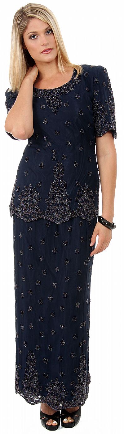 Round Neck Half Sleeves Beaded Two Piece Blouse & Skirt set. Floral beaded pattern in multi colored beads along the neckline, hem of blouse & skirt & sleeves. 26" long shoulder padded blouse has a back zipper closure & 39" skirt has a long slit in the back as seen in the picture. Made of 100% silk chiffon. Imported.