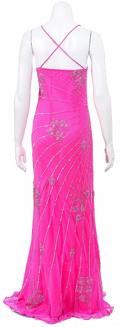 Floor length dress is perfect for prom or any formal event. Dress has diagonal sequined accents and floral beaded patches all over the dress. Flared dress has wide round neckline with thin spaghetti straps that criss cross at the back. Side zipper closure. Dress comes with matching short jacket also hand beaded and sequined. Made of 100% silk with polyester lining. Imported.
