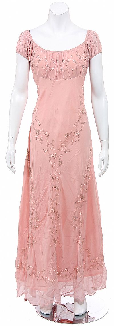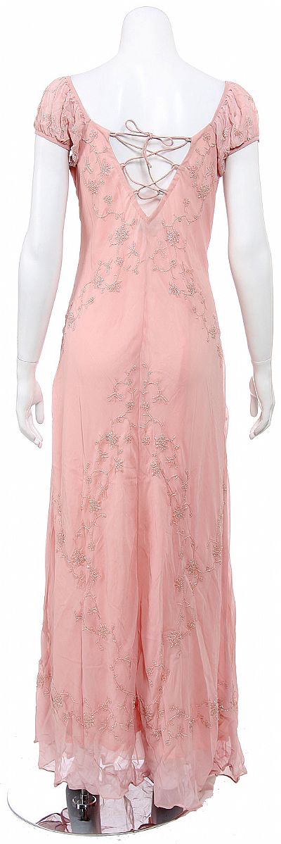 Romantic prom dress is adorned with hand beaded floral details. Dress has a boat neckline, sheer short sleeves, rouched details along the bust area, a criss-cross lace tie in the back & side zipper closure. Made of 100% silk with polyester lining. Imported.
