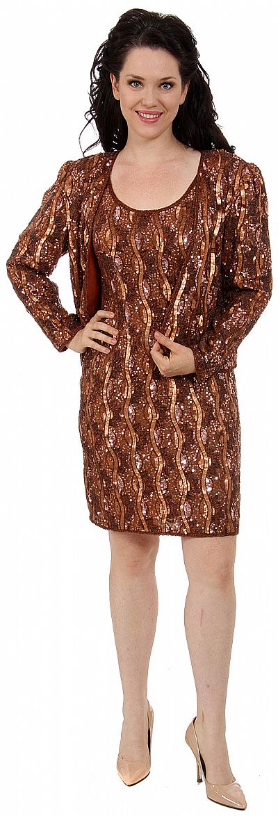 Sequined short party dress with beaded design. Hand-beading over natural silk chiffon and acetate lining. Matching jacket included. Dress length 39 inches approx. Jacket length 20 inches approx.