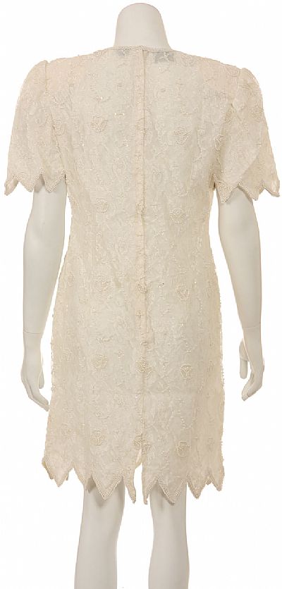 V-Neck fully beaded short sleeved dress. Made with cleats along the sleeves and hem. Back zipper closure. Made of 100% Silk chiffon.