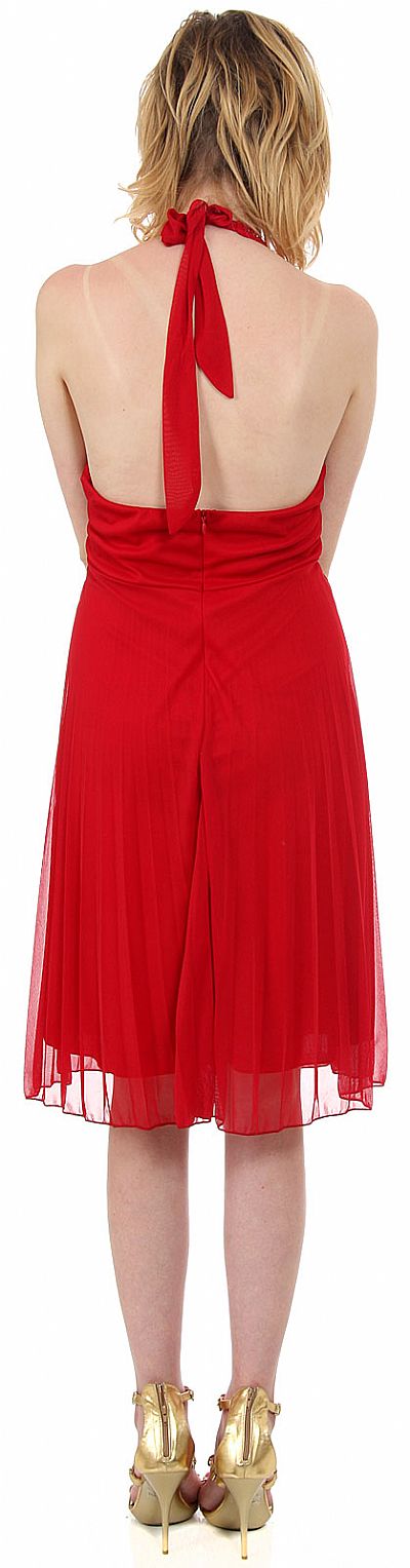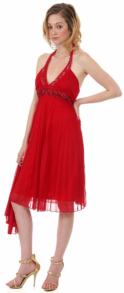 Halter Neck Empire Cut Beaded Formal Party Dress. Neckline as well as empire waistband is beaded with sequins. Knee length dress has a tie in the back closure with zipper closure also. 100% polyester chiffon. Made in USA.