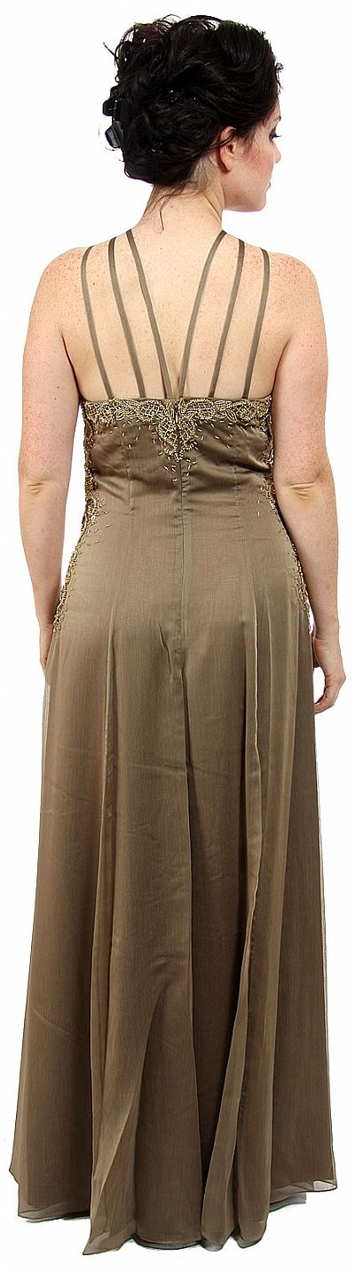 Beautiful Halter Neck A-Line Gown with Triple Straps. Ruched bust with beading below the bust line extended on the sides of the dress. Back zipper closure. Imported.