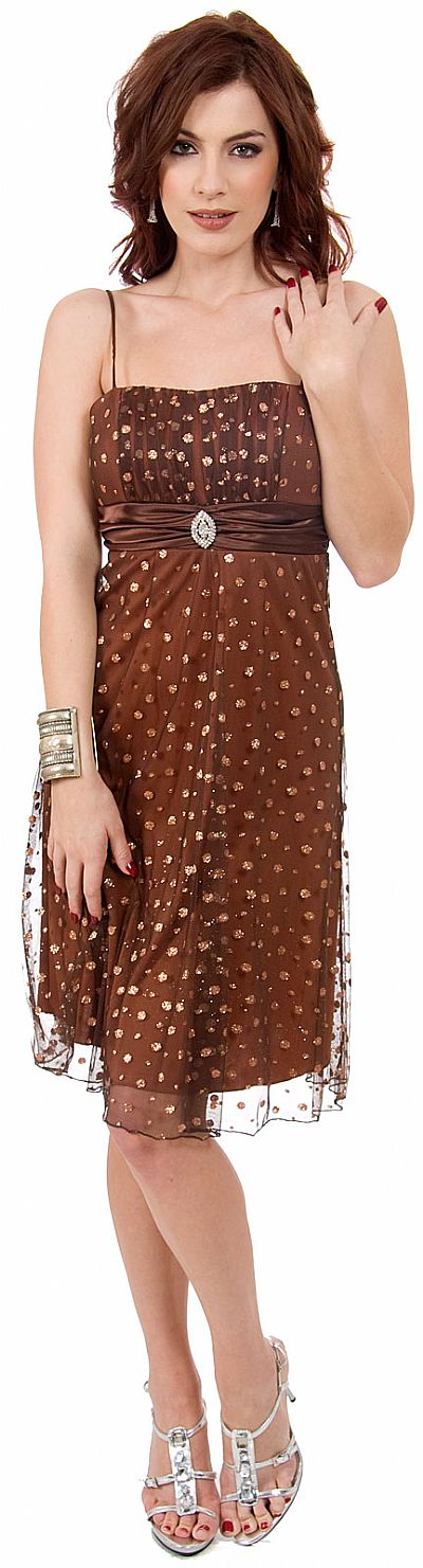 Empire Cut & Glittered Knee length party Dress. Satin belt below the bust-line is shirred with a brooch on it. The length is about 40 inches from the shoulder to the hemline. Made in USA.