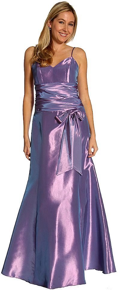 A-line formal dress with shirred waist and ribbon bow on the side. The dress is spaghetti strapped with back zipper closure.