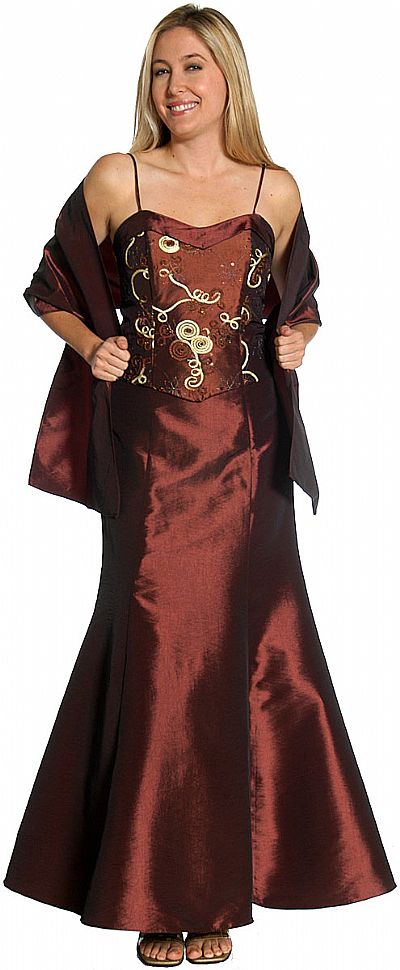 Embroidered Top Spaghetti Straps Formal Evening Dress. Two tone shiny taffeta fabric dress with embellished top having spaghetti straps. Flared mermaid style hemline on skirt & back zipper closure. Made in USA.