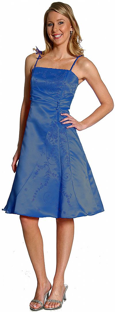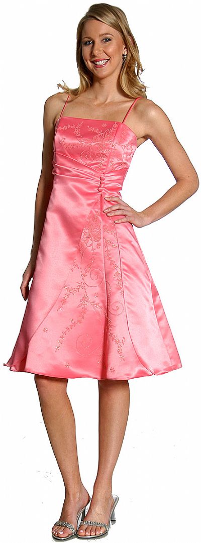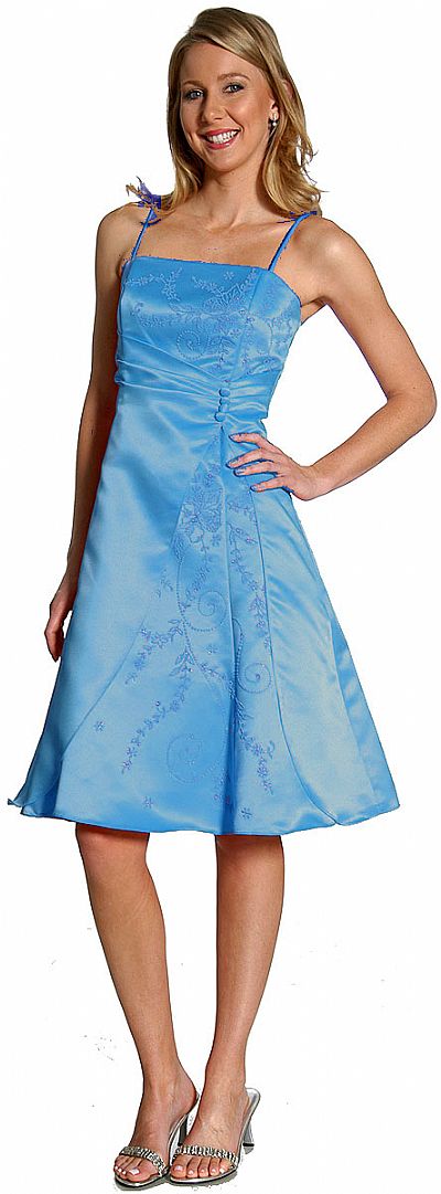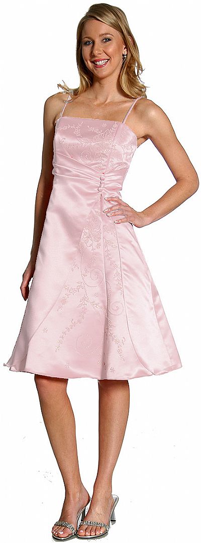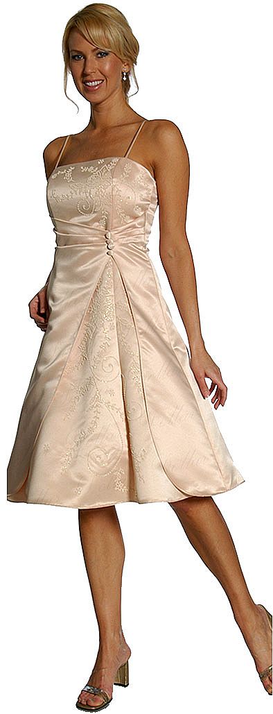 Spaghetti strapped a-line short bridesmaid dress with shimmering floral pattern at the bodice & on the skirt. Pleated along the waistline with button accents on the side.