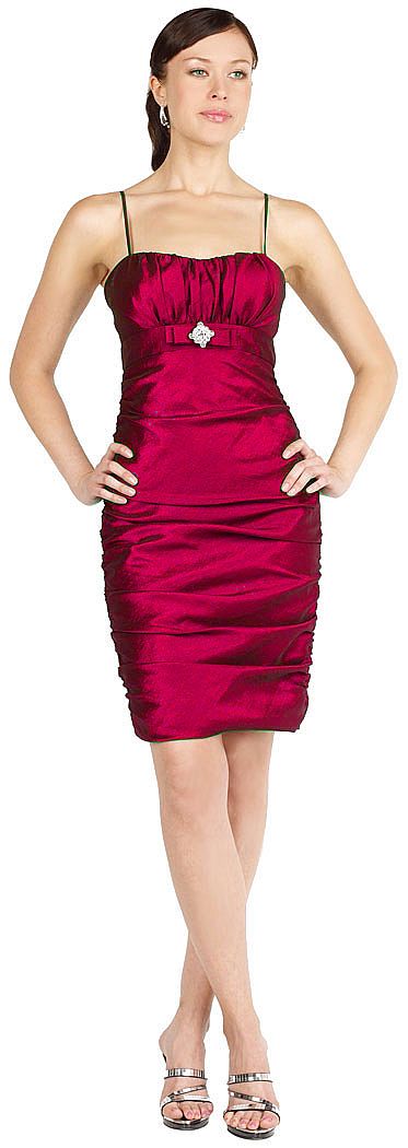 Figure hugging homecoming dress with shirred sides and bust; Bow and diamond broach. Dress length is approx. 38 inches.