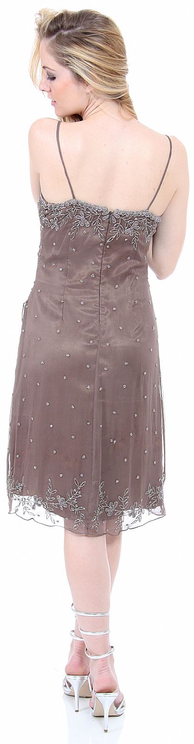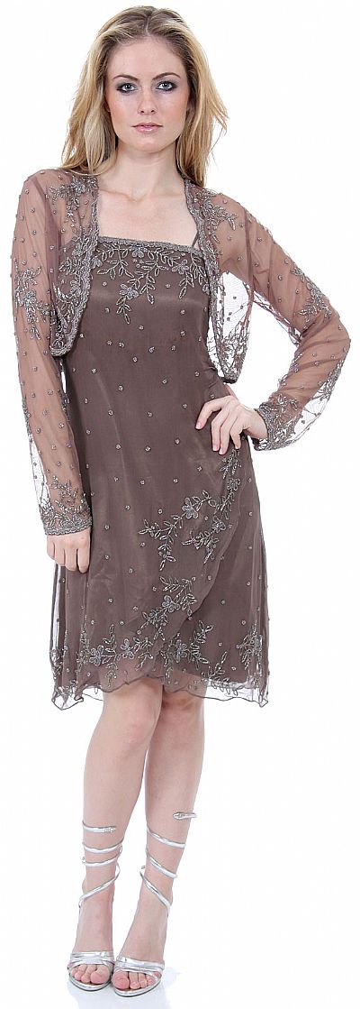 Spaghetti Straps Knee Length Beaded Formal Dress with Matching Mesh Jacket. Wrap around style skirt of the dress. Stems with flowers beaded design along neckline and hem. Short full sleeves beaded mesh jacket included. Made of 100% silk chiffon.