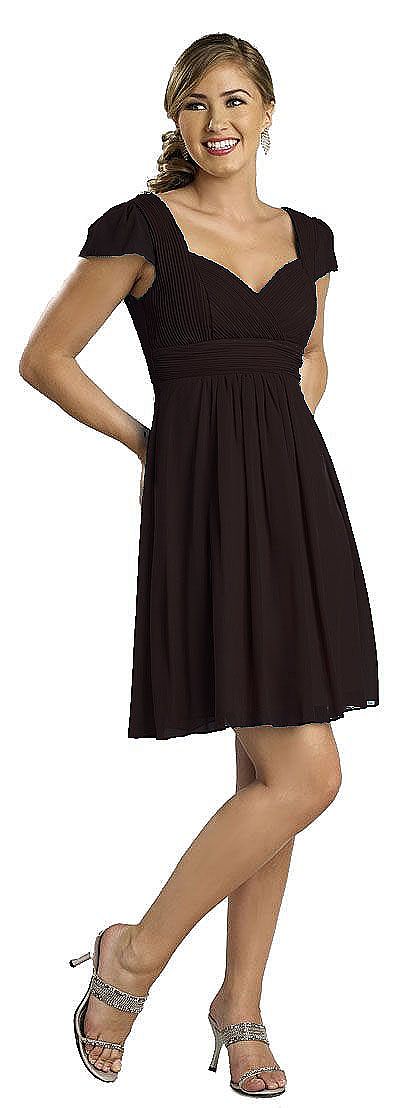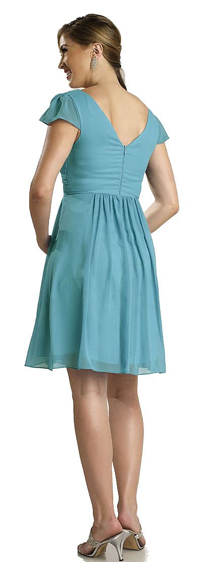 A modestly-styled short party dress with half sleeves and shirred bodice. Dress accentuates the bust while modestly covering shoulders.