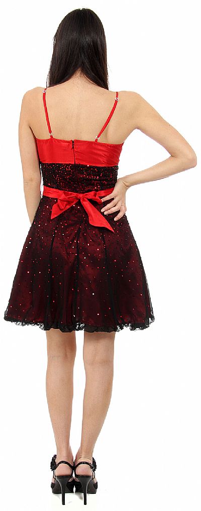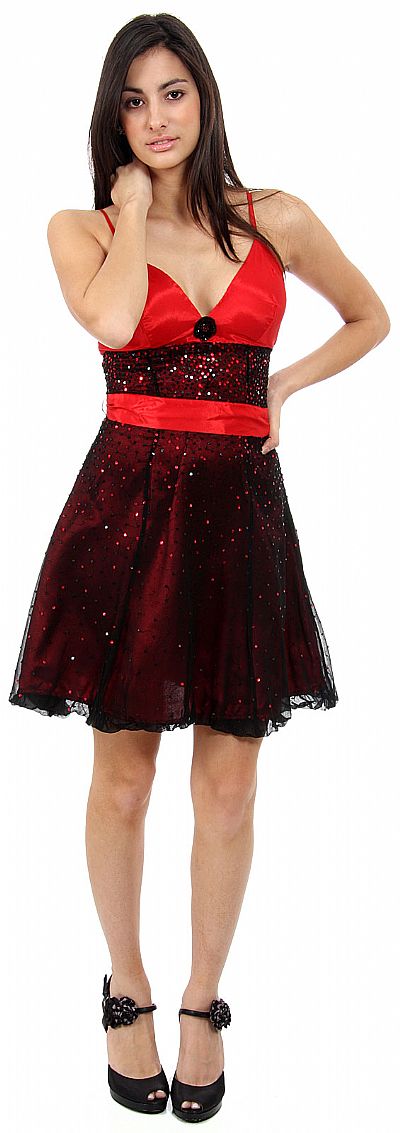 Spaghetti Straps Short Sequined Party Dress with Removable Sash. Dress has solid bust with sheer silk chiffon skirt over solid colored polyester lining. Removable sash can be tied anywhere around waist & has adjustable spaghetti straps. Sequins all over the skirt which has little ruffled hemline. Imported.