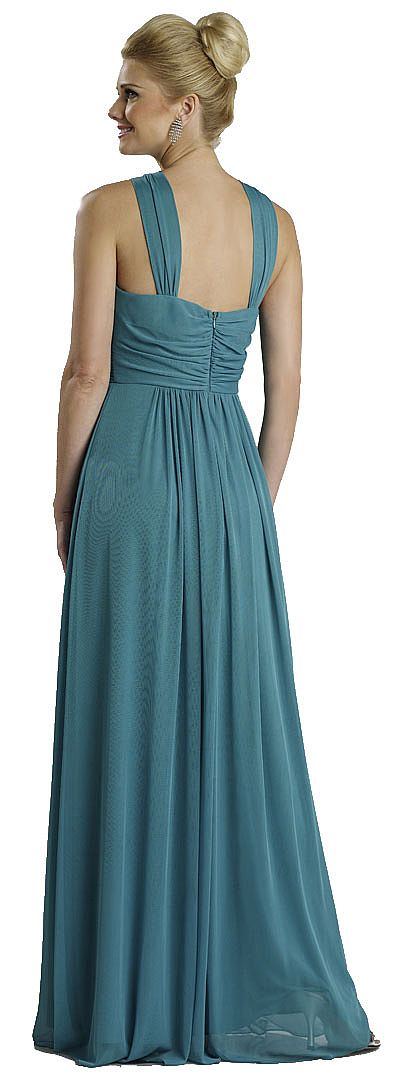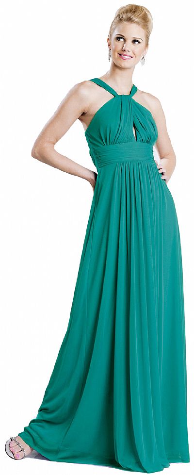 *The color the model is wearing is unavailable* Free flowing full length halter neck evening dress with keyhole bodice. The shade of the Turquoise color is dark.