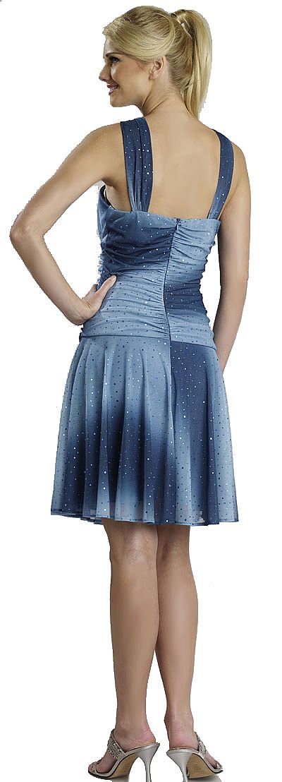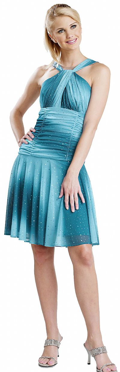Halter Neck Ombre Short Party dress in shimmering dots fabric. The dress has ruched & fitted waistline and bust area is also ruched. Broad straps at the back with zipper closure. Made in USA.